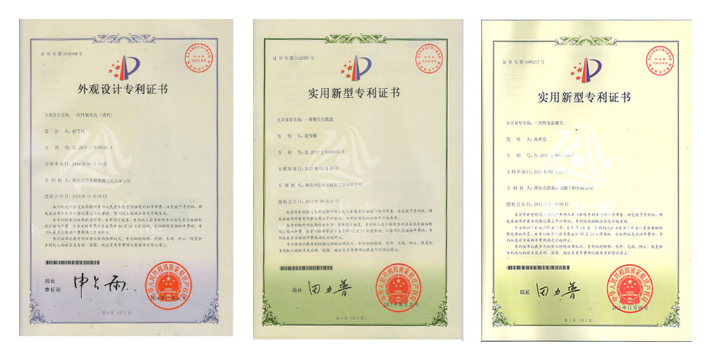 经过多年的不懈努力,昌泰人赢得了国家有关部门的认可和业内的好评及殊荣,先后获取了多项荣誉证书:ISO9001国际质量管理体系认证·QS食品安全认证··一次性水果APP下载IOS版餐具实用新型专利证书·餐具包装盒实用新型专利证书·一次性餐饮具外观专利证书·315消费维权先进单位。